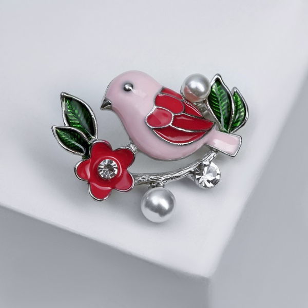 Брошь "Птичка" на жемчужной ветке, цветная, цвет серебристый (пластик, стразы, эмаль, бижутерный сплав)