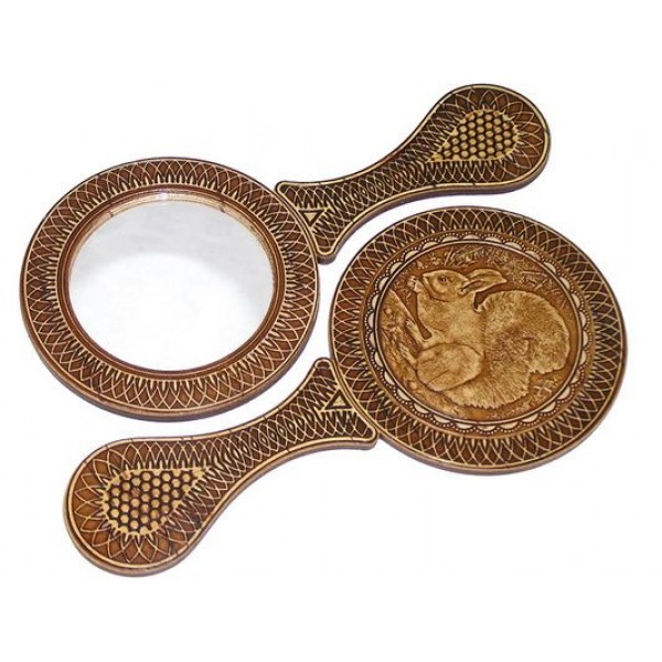 Зеркало береста круглое 160х85мм с ручкой "белочка"