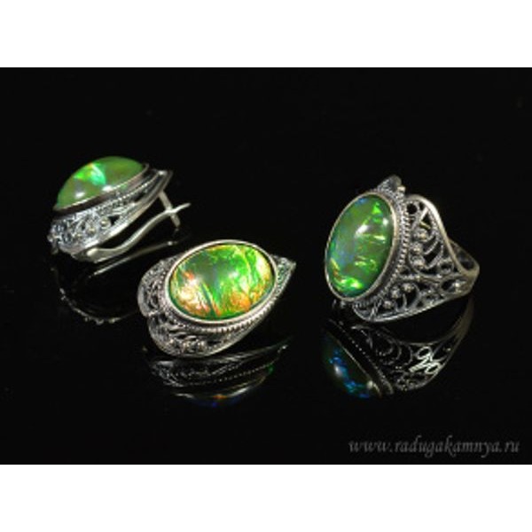 Кольцо и серьги с опалом искусственным, цвет зеленый