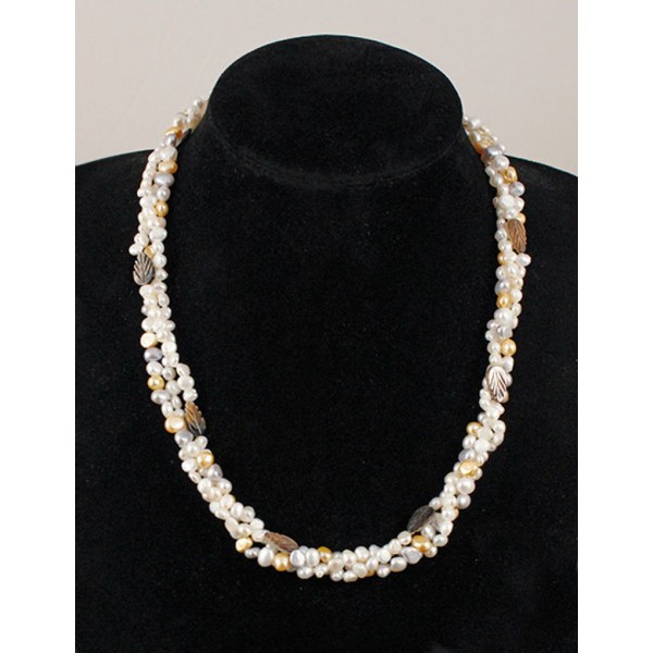 Бусы из жемчуга барокко с листиками серебристыми из перламутра, жгут 3 нити, цвет белый, кремовый, микс