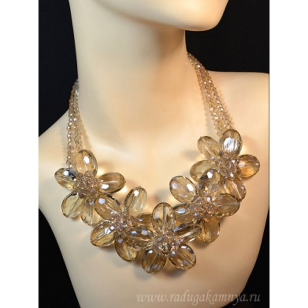 Колье с цирконами 2 нити 5 цветков 55мм цвет шампань, 50см