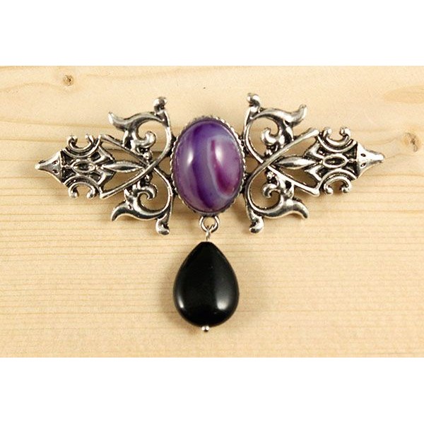 Брошь из агата фиолетового (тонир.) "вензель", основа 70х2.4мм, овал 18х13мм, подвеска агат черный