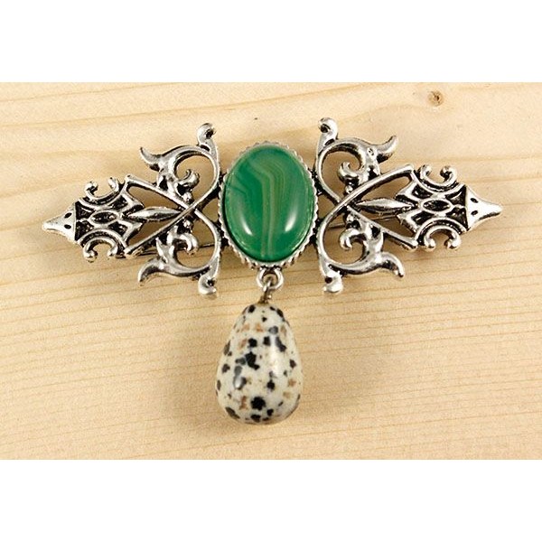 • Брошь из агата зеленого (тонир.) "вензель", основа 70х2.4мм, овал 18х13мм, подвеска яшма далматиновая