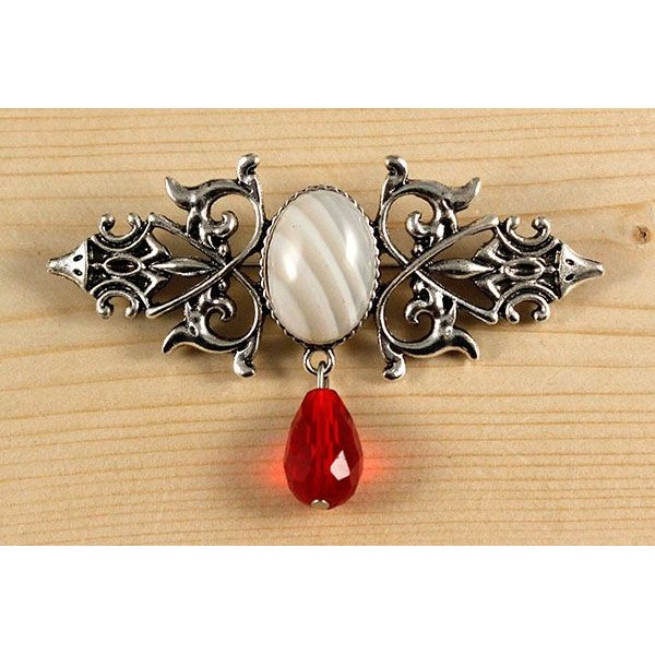 Брошь из агата белого "вензель", основа 70х2.4мм, овал 18х13мм, подвеска красная