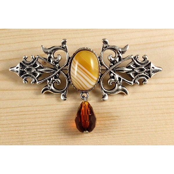 Брошь из агата желтого (тонир.) "вензель", основа 70х2.4мм, овал 18х13мм, подвеска цвет коньячный