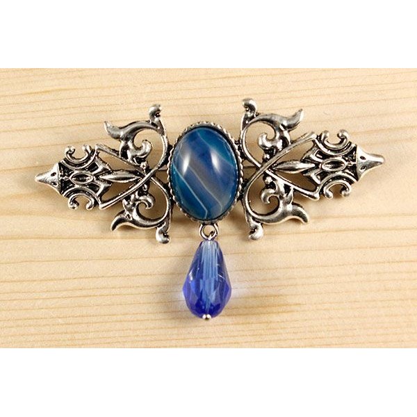 Брошь из агата синего (тонировка) "трюмо", овал 18х13мм, со стразами и подвесками из горного хрусталя