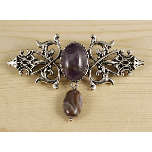 Брошь из аметиста "вензель", основа 70х2.4мм, овал 18х13мм, подвеска агат серый
