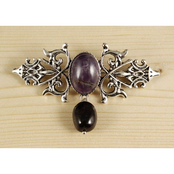 Брошь из аметиста "вензель", основа 70х2.4мм, овал 18х13мм, подвеска гранат