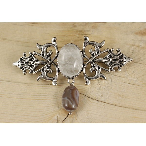 Брошь из горного хрусталя "вензель", основа 70х2.4мм, овал 18х13мм, подвеска агат серый