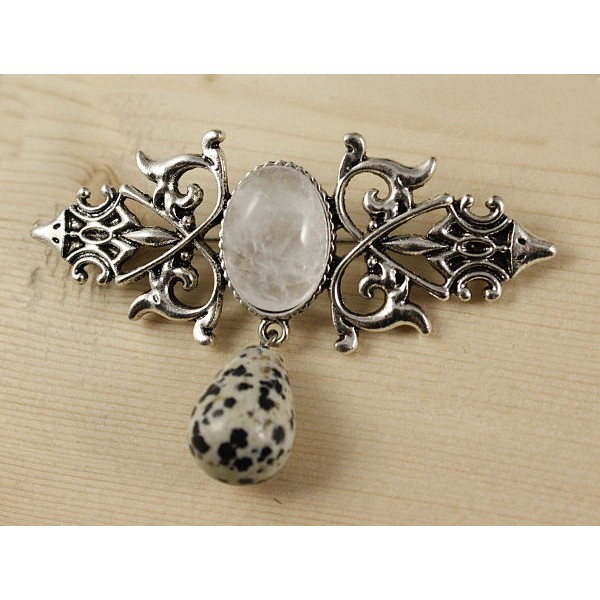 Брошь из горного хрусталя "вензель", основа 70х2.4мм, овал 18х13мм, подвеска яшма далматиновая