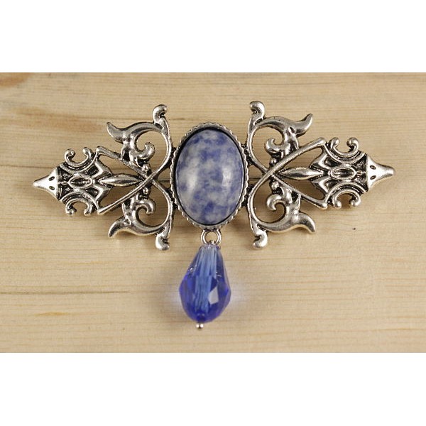 Брошь из лазурита бело-синего "трюмо", овал 18х13мм, со стразами и подвесками из хрусталя