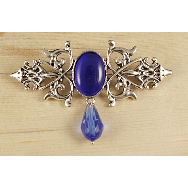 Брошь из кошачьего глаза (иск., синий индиго) "вензель", основа 70х2.4мм, овал 18х13мм, подвеска синяя