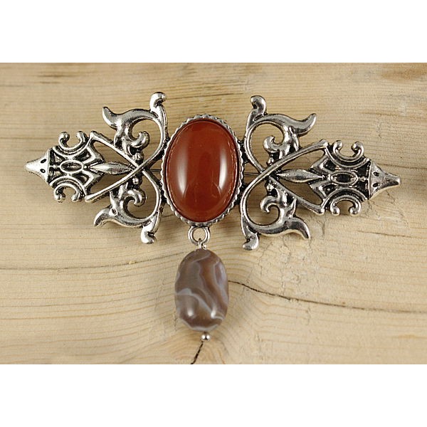 Брошь из сердолика "вензель", основа 70х2.4мм, овал 18х13мм, подвеска агат серый