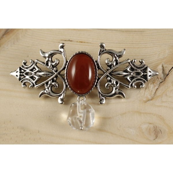 Брошь из сердолика "вензель", основа 70х2.4мм, овал 18х13мм, подвеска горный хрусталь
