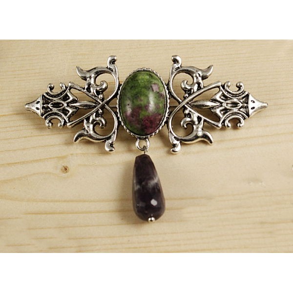 Брошь из цоизита "вензель", основа 70х2.4мм, овал 18х13мм, подвеска аметист