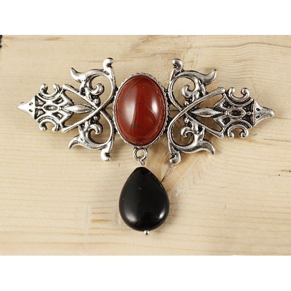 • Брошь из яшмы красной "вензель", основа 70х2.4мм, овал 18х13мм, подвеска агат черный