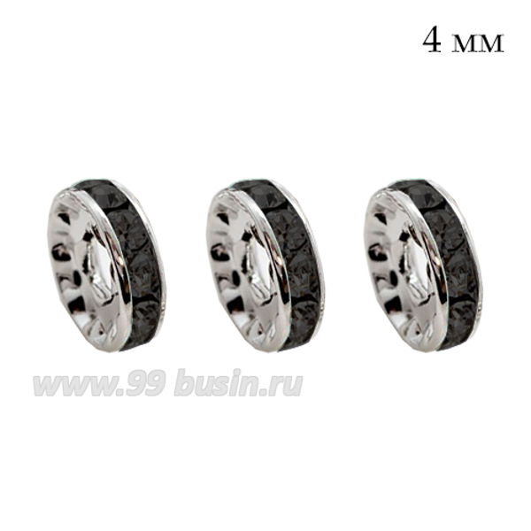 Рондель 4 мм, ровный край, цвет светлое серебро, черные стразы 10 штук/упак