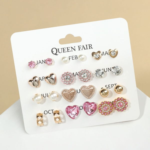 Пусеты 12 пар "Фантазия" сердца, бело-розовый, цвет золотистый