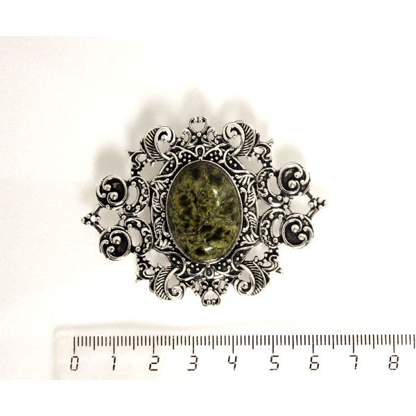 Брошь из змеевика, с ажурным контуром, цвет ант. серебро, овал 25х18мм