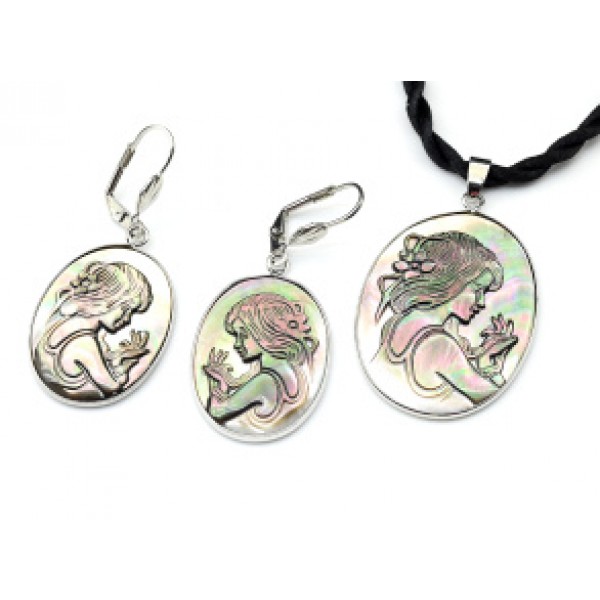 Камея на голубом перламутр Кулон и серьги 27*35мм, 49см