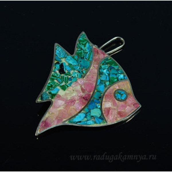 Кулон мозаика "Рыбка" из хризоколлы и турмалина, 47*61мм.