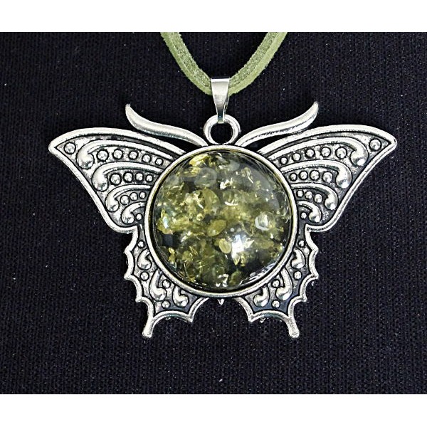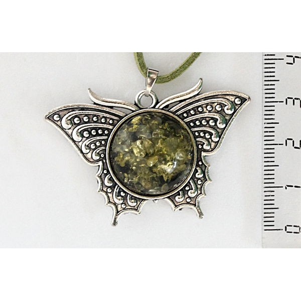 Кулон из янтаря (переплавленый) "бабочка", цвет зеленый, круг 20мм