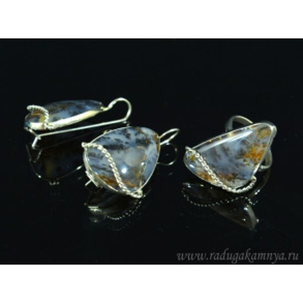 Комплект: кольцо и серьги из агата мохового, капли, мельхиор