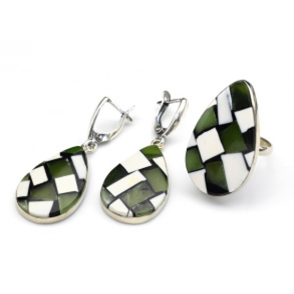 Кольцо и серьги "Мозаика" из нефрита и кахолонга