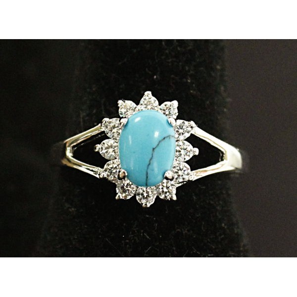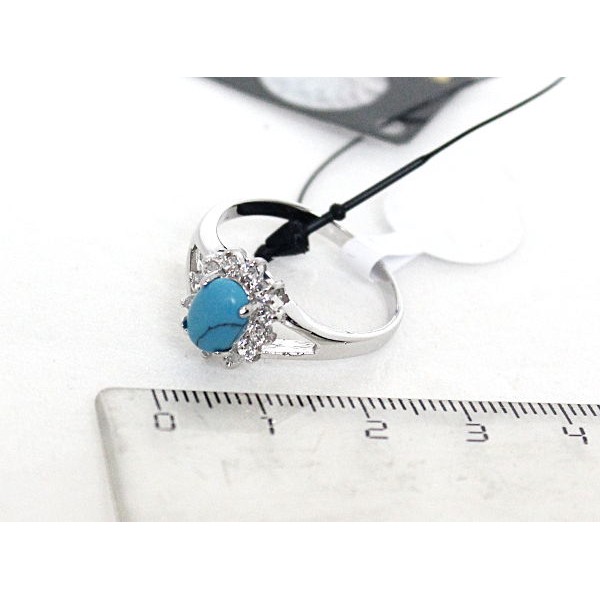 Кольцо с бирюзой (имитация), родиум, цвет темно-голубой "малый овал в цирконах"