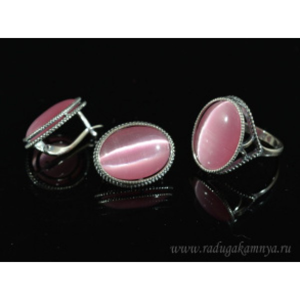 • Кольцо и серьги с кошачьим глазом, цвет розовый