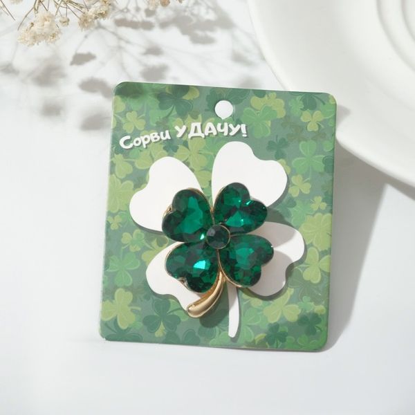 Брошь "Клевер" четырёхлистный со стразой, цвет бело-зелёный, цвет золотистый
