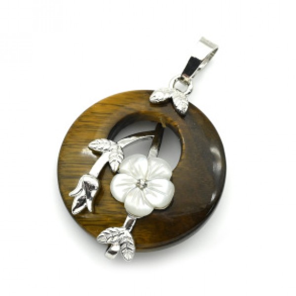 • Кулон с камнем из тигрового глаза круг 27мм с цветами