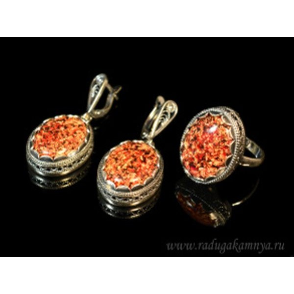 Кольцо и серьги с опалом искусственным, цвет красный (иск.)