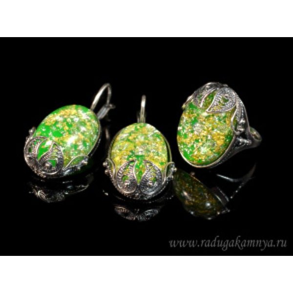 Кольцо и серьги с опалом искусственным, цвет салатовый (иск.)