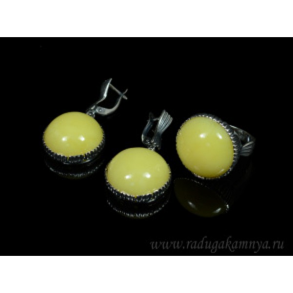 Набор с янтарём кольцо, серьги круг 22мм молочный, (иск.)