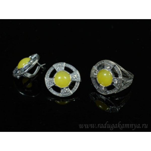 • Набор с янтарём кольцо, серьги "штурвал" 20мм молочный,  (иск.)