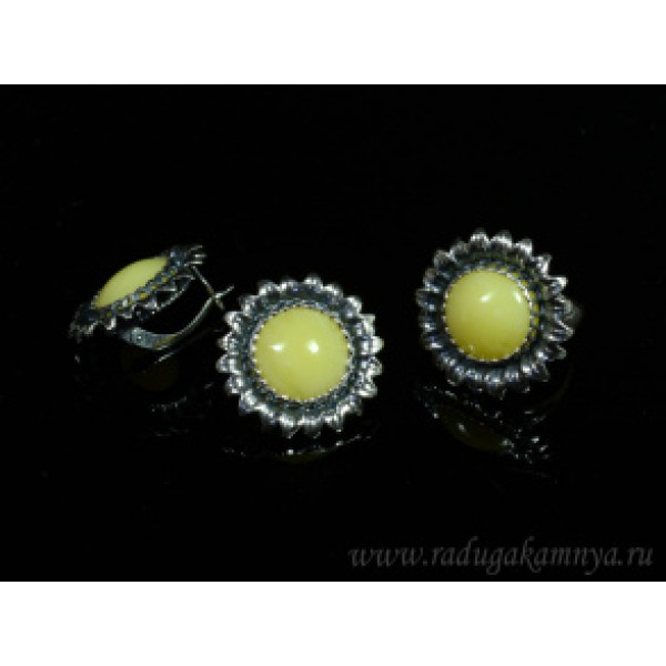 Набор с янтарём кольцо, серьги "подсолнух" 26мм молочный (иск.)