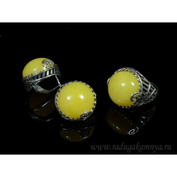 Набор с янтарём кольцо, серьги круг 22мм молочный, (иск.)