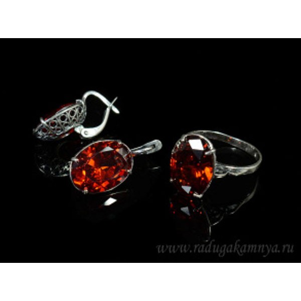 Кольцо и серьги с цирконом искусственным, цвет красный (иск.)
