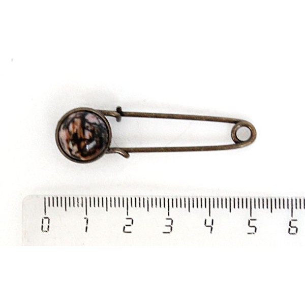 Брошь-булавка с родонитом, круг 12мм, цвет бронза