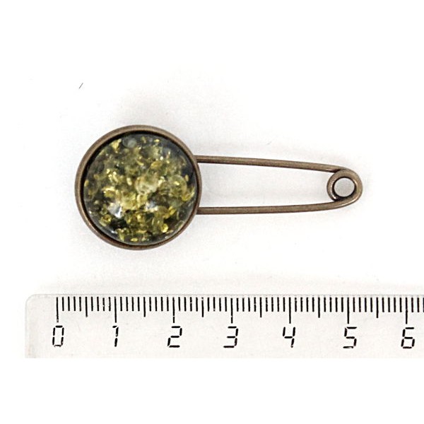 Брошь-булавка с янтарем (переплавленый), цвет зеленый, круг 20мм, основа цвет бронза
