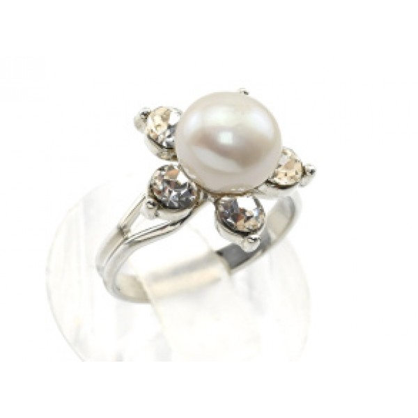 Кольцо с жемчугом 8-9мм и стразами, белый.