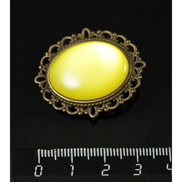 Брошь пластик желтый (эффект опала), с ажурным контуром, цвет бронза, овал 25х18мм