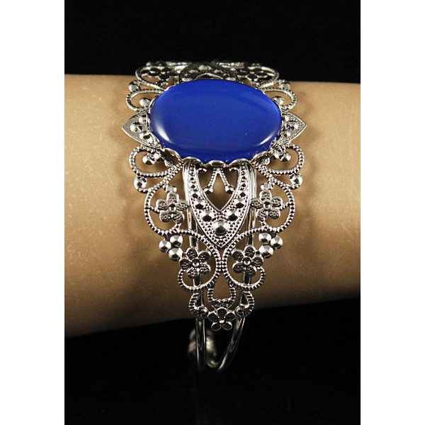 Браслет из агата синего (тонировка), овал 25х18мм, жесткая основа цвет ант.серебро
