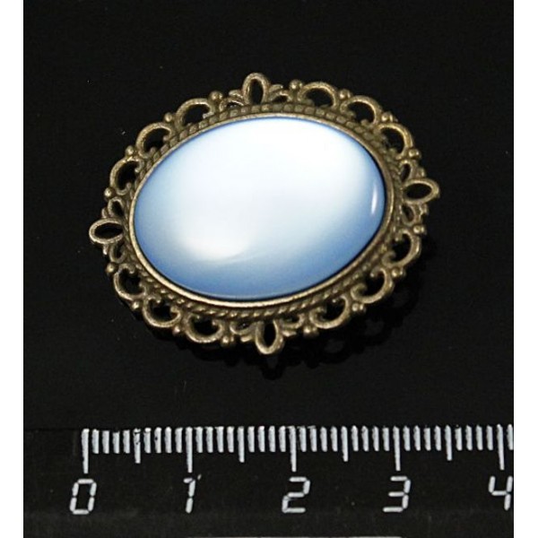 Брошь пластик голубой (эффект опала), с ажурным контуром, цвет бронза, овал 25х18мм