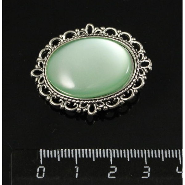 Брошь пластик мятный (эффект опала), с ажурным контуром, цвет ант. серебро, овал 25х18мм