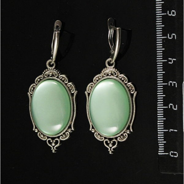 Серьги пластик мятный (эффект опала), овал 25х18мм, оправа "медальон", швензы посеребрение