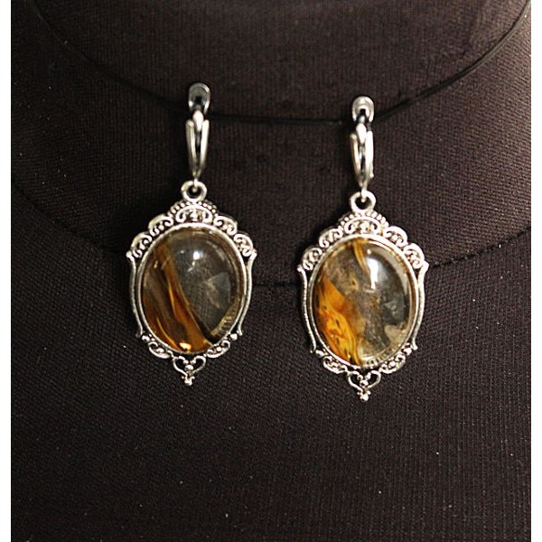 Серьги из янтаря темный, (кабошон-мозаика), овал 25х18мм, оправа "медальон", швензы посеребрение