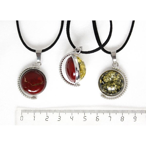 • Кулон из яшмы красной и янтаря зеленого (переплавленного), круг 20мм, оправа "глобус", двусторонний