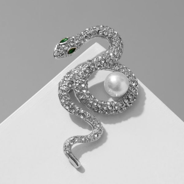Брошь "Змея" вокруг жемчужины, цвет бело-зелёный, цвет серебристый